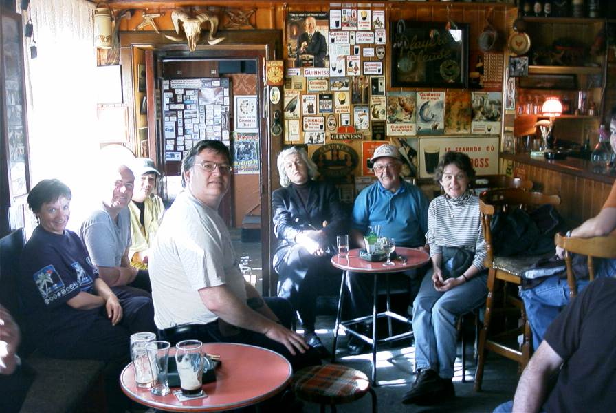 Rusty Mackeral, TeelinNo, really, it wasn't all pubs! This was a cooling glass of Club lemon in the Rusty Mackeral at 5p.m. after the Environment class had climbed (a bit of) Sliabh Liag on a very hot day. (left to right) Annie, Seán (the teacher), Maire,me,Oona, Tony, Molly and a bit of Susan.